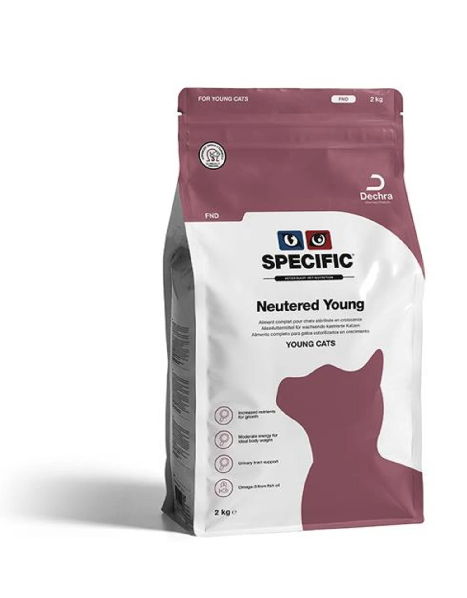 Specific Neutered Young is een gespecialiseerd dieet voor jonge gecastreerde katten. Onlangs gecastreerde katten vertonen vaak een verhoogde eetlust die kan leiden tot gewichtstoename als het dieet ongewijzigd blijft. Specific Neutered Young heeft een laag caloriegehalte om ervoor te zorgen dat uw kat op het ideale gewicht blijft. Om jonge katten te ondersteunen bij hun ontwikkeling nemen hoogwaardige eiwitten en essentiële vitamines een groot deel van het recept van het mengsel op. Ten slotte helpen omega-3 vetzuren de neurologische conditie en het onderhoud van een bekwaam lichaam te ondersteunen. Specific Neutered Young , streef naar perfectie.
