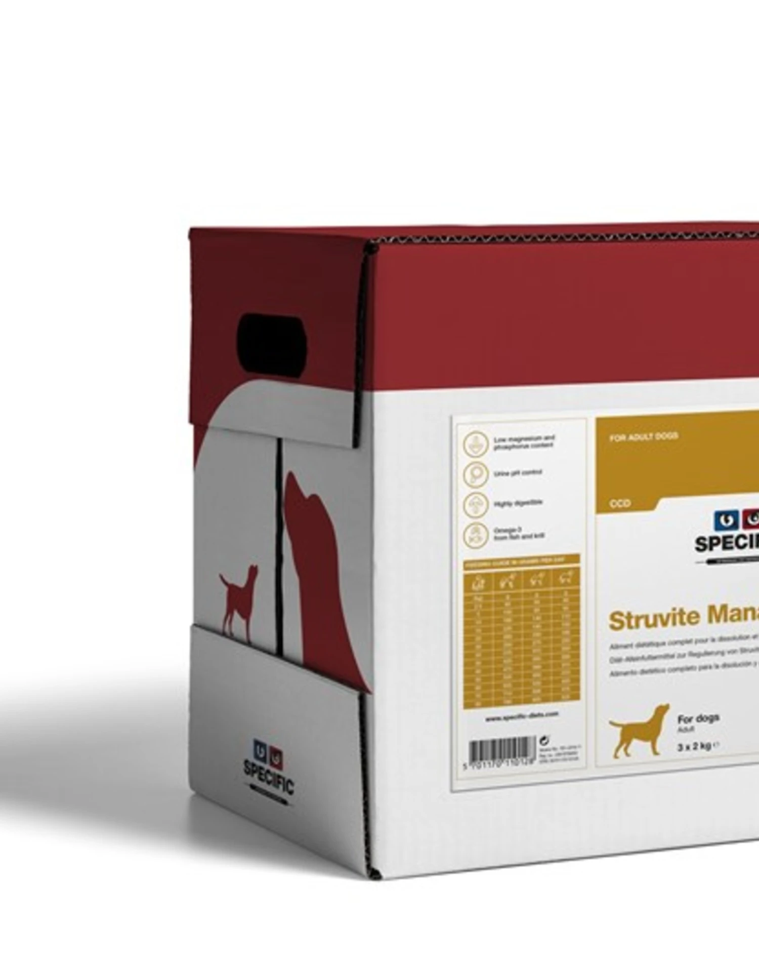 Het kan zijn dat uw hond niet vaak genoeg drinkt. Of een of ander ongelukkig voorval heeft ertoe geleid dat hij struvietstenen in zijn urinewegen heeft. Om deze op te lossen, kan verandering van spijs al het werk voor uw hond doen. Specific Struvite Management is een mengsel dat een zuur ingrediënt bevat dat de stenen oplost voordat ze een probleem worden. Door het verminderen van kristallisatie-ingrediënten heeft uw hond minder kans op nierproblemen. Ten slotte zal de waterinname van uw hond toenemen als gevolg van het zoute eten van Specific Struvite Management . Dit zal alle overgebleven afzettingen overspoelen om ervoor te zorgen dat uw hond blijvend van dit ergerlijke probleem is bevrijd. PAS OP: Gebruik dit niet om calciumoxalaat, cysteïne of uraatstenen op te lossen. Specific alternatieven om deze problemen op te lossen zijn Specific Heart/Kidney Support of Specific Food Senstivity. Als u het nog steeds niet zeker weet, neemt u contact op met uw plaatselijke dierenarts om te bepalen welk speciaal voer voor uw hond geschikt is.